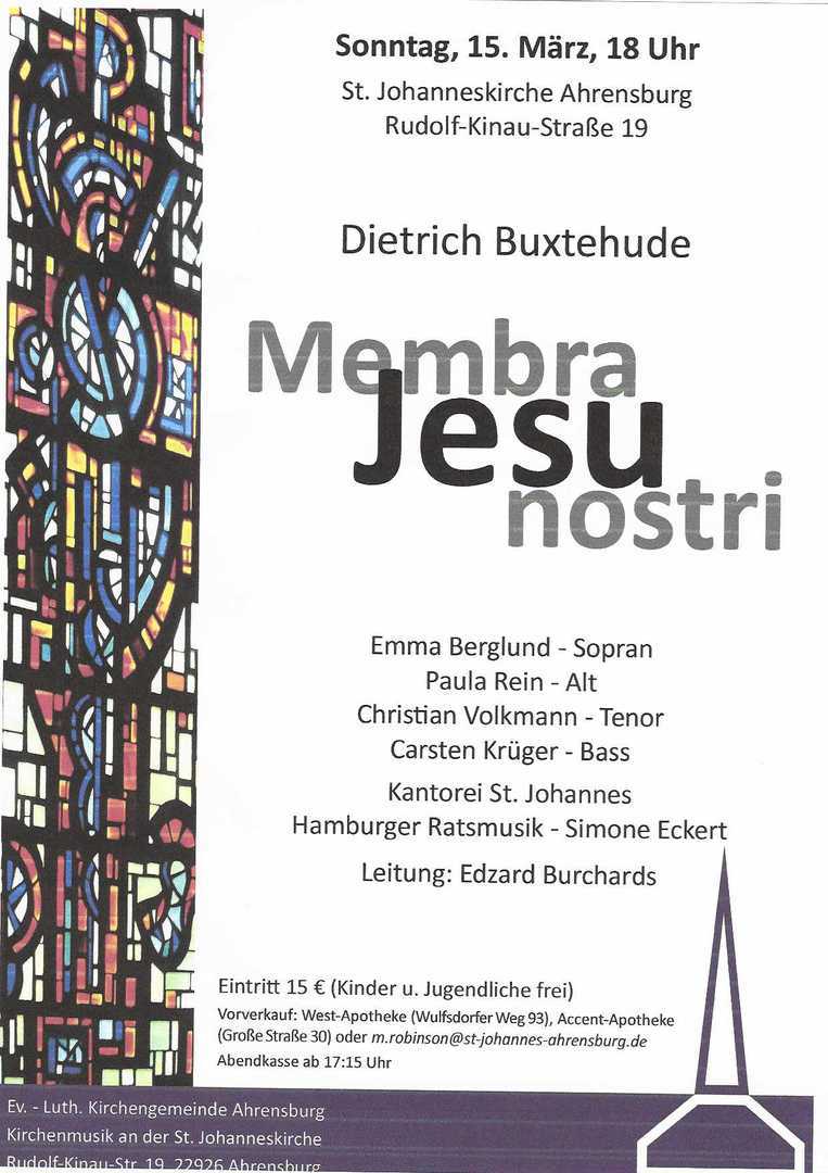Eintrittskarten zu 15 € (Kinder, Jugendliche freier Eintritt) sind im Vorverkauf (West-Apotheke, Wulfsdorfer Weg 93 oder m.robinson@st-johannes-ahrensburg.de) und an der Abendkasse erhältlich.